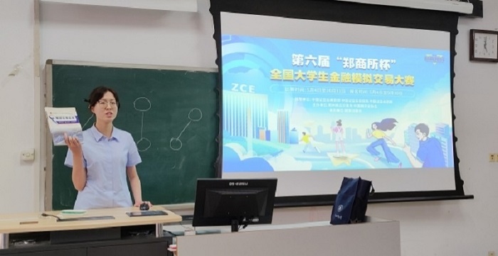 隨后,投資咨詢部分析師王大元為學(xué)生介紹了第六屆鄭商所杯模擬交易大賽,講解了期貨交易過(guò)程中出現(xiàn)的“加倉(cāng)”“鎖倉(cāng)”等概念,并對(duì)如何使用交易軟件進(jìn)行了重點(diǎn)解讀,引導(dǎo)同學(xué)們?cè)诠倬W(wǎng)學(xué)習(xí)專區(qū)進(jìn)行學(xué)習(xí),鼓勵(lì)同學(xué)們踴躍參賽,爭(zhēng)創(chuàng)佳績(jī)。