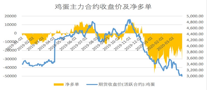 我們選取會(huì)員單位前20名作為品種的主力資金動(dòng)向的參考,相關(guān)性較強(qiáng),但指標(biāo)滯后,不能作為短線交易指示。滯后指標(biāo),可以用來印證趨勢。本周主力資金繼續(xù)流出,多空主力資金均有減倉動(dòng)作,資金關(guān)注度逐漸下降。當(dāng)前雞蛋價(jià)格上下兩難,炒作空間逐步變小,這就意味著上漲的可能性降低。