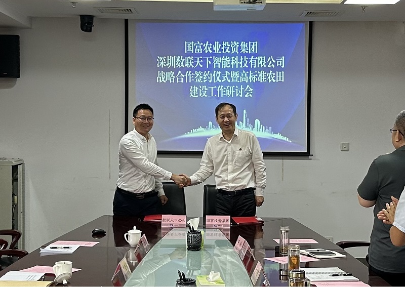 7月2日,國富農(nóng)業(yè)投資集團(tuán)與深圳數(shù)聯(lián)天下智能科技有限公司簽訂戰(zhàn)略合作協(xié)議,為國富農(nóng)業(yè)投資集團(tuán)加快培育農(nóng)業(yè)新質(zhì)生產(chǎn)力、打造省內(nèi)一流高標(biāo)準(zhǔn)農(nóng)田建設(shè)項目注入科技新活力。國富農(nóng)業(yè)投資集團(tuán)黨委副書記、副董事長、總經(jīng)理張立忠,集團(tuán)黨委常委、常務(wù)副總經(jīng)理馬國棟,集團(tuán)黨委委員、副總經(jīng)理李其強,及相關(guān)業(yè)務(wù)骨干同數(shù)聯(lián)天下副總裁鄧才良一行進(jìn)行工作研討并見證簽約儀式。